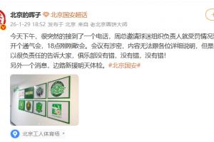 博主北京的晖子发文:今天下午,很突然的接到了一个电话,周总邀请球迷组织负责人就受罚情况到工体开个通气会,18点刚刚散会。会议有涉密,内容无法跟各位详细说明,但是我可以很负责任的告诉大家,俱乐部没有错,没有错,没有错!