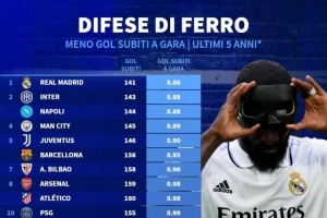 体育资讯11月15日讯 德国转会市场统计了2020-2021赛季以来球队在五大联赛中的场均失球,并列出场均失球最少榜单,皇马0.86球居首,国米、那不勒斯前三。