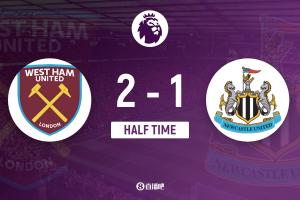 上半场比赛结束,西汉姆联2-1纽卡斯尔联。