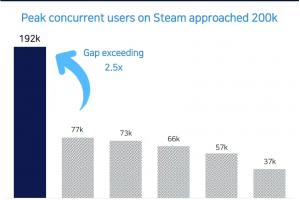 开发商 Shift Up 官方图表显示,《剑星》Steam 最高同时在线玩家数一度曾达到 19.2 万人,在曾推出 PC 版本的 PlayStation 独占游戏中位列第一。(第二名是《对马岛之魂》7.7万人)