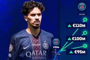 体育资讯12月3日讯 德国转会市场预热巴黎中场维蒂尼亚的身价变化,这位葡萄牙球员的身价确定上涨,最高可能达到1.1亿欧元。