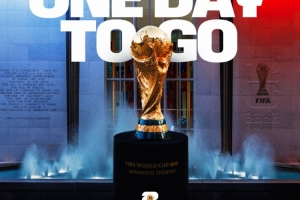 世界杯官方社媒晒出倒计时一天海报,预热世界杯抽签仪式,大力神杯出镜。