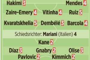 体育资讯11月5日讯 巴黎在本轮欧冠焦点战主场1-2不敌拜仁,马尔基尼奥斯送礼、迪亚斯双响后染红,《图片报》在赛后为两队进行了评分:(1分最佳、5分最差,6分相当于负分)