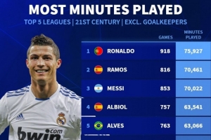 体育资讯12月5日讯 德国转会市场统计了21世纪非门将球员在五大联赛的出场时间,并列出榜单,C罗居首,拉莫斯、梅西二三位。