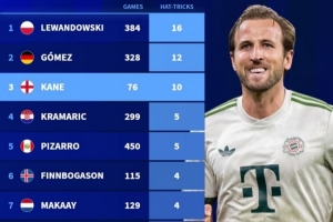 体育资讯12月9日讯 德国转会市场盘点了21世纪德甲球员帽子戏法次数排名,凯恩10次已经来到第三位。