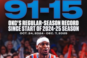 上赛季常规赛雷霆68胜14负;本赛季至今他们23胜1负。