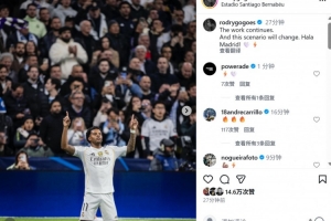 本场比赛罗德里戈率先破门,打破个人连续32场进球荒,他在社媒晒出本场照片,配文写道:“还要继续努力,我们会改变现状,Hala Madrid! 🤍⚡️”