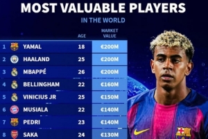 体育资讯12月13日讯 德转列当前身价排名前十五的球员,亚马尔、哈兰德、姆巴佩2亿欧并列第一。