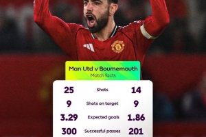 本场比赛曼联25次射门9次射门,伯恩茅斯则是14次射门9次射正,两队相加共计完成39次射门,这也创造了本赛季英超单场射门次数纪录。