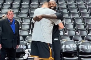 GIF-约基奇赛前和杰夫·格林拥抱热聊