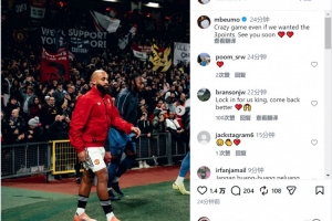 姆伯莫社媒晒出比赛照片,并写道:“疯狂的比赛,尽管我们本希望全取三分,回头见!”