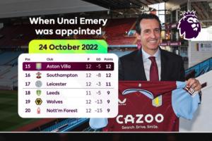 22/23赛季埃梅里于2022年10月底接手维拉,当时维拉排名英超第15,该赛季结束后维拉排名第7。随后的23/24赛季维拉排名第4,24/25赛季排名第6,本赛季至今暂列第3。