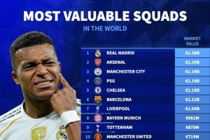 体育资讯12月25日讯 德转更新各联赛球员身价,并列出了俱乐部身价排名,皇马13.8亿欧居首,阿森纳、曼城前三。