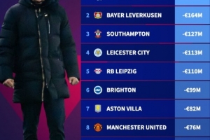 3、南安普顿:-1.27亿欧