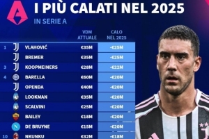 体育资讯1月1日讯 2025年已经结束,《转会市场》也统计了意甲年度身价跌幅榜,弗拉霍维奇和布雷默并列最多。