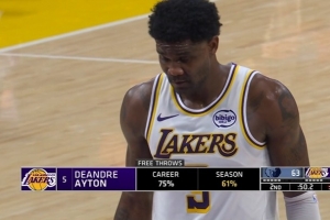 艾顿职业生涯罚球命中率为75%,但本赛季罚球命中率仅61%。