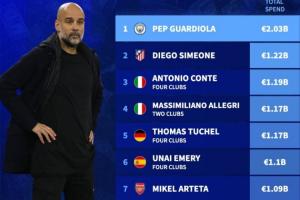瓜迪奥拉执教曼城以来主帅引援花费榜:(单位/欧元)