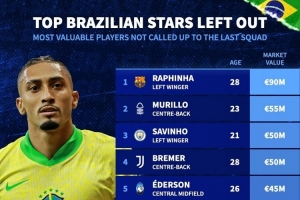 未入选本期巴西队名单球员身价榜(包括因伤缺席):