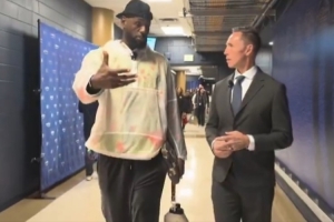 体育资讯3月6日讯 今日NBA焦点战,湖人客场挑战掘金,詹姆斯赛前到场后见到了自己的播客搭档纳什。