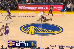 半场最后一攻 詹姆斯三分线被包夹 传给海斯投三分 离谱偏出