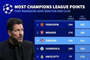 执教单一俱乐部欧冠拿分榜:(淘汰赛胜利计为3分)