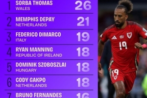 体育资讯11月20日讯 本届世欧预小组赛已经告一段落,squakwa也统计了本届赛事成功传中情况,威尔士边锋索尔巴·托马斯领跑。