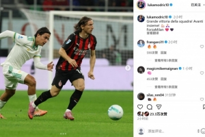 本场比赛40岁莫德里奇首发打满全场,他也在社媒晒出本场与迪巴拉对抗照片,配文写道:“团队取得伟大胜利!让我们携手前进!加油米兰!”