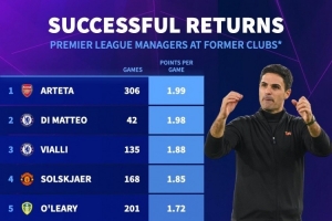 体育资讯11月21日讯 德国转会市场统计了教练执教球员时代英超老东家的场均积分,并列出榜单,阿尔特塔1.99分居首,迪马特奥1.98分次席。