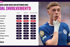 自帕尔默为切尔西首秀以来的英超直接参与进球榜: