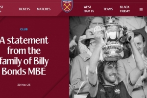 西汉姆联俱乐部怀着深切的悲痛和无比沉重的心情,发布这位传奇球员、教练和主教练比利·邦兹MBE的家族声明: