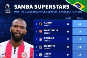 体育资讯12月13日讯 巴西球员英超单赛季进球排行榜出炉,24/25赛季库尼亚33场15球排名第1,本赛季伊戈尔·蒂亚戈15场11球暂居第13。
