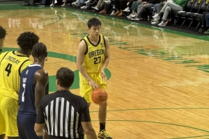 在上半场的比赛中,林葳代表俄勒冈大学替补登场6分钟,3投0中,三分2中0、罚球2罚1中,拿到1分1犯规。