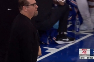不顺!杜兰特第三节仅1次出手1分进账 早早4犯枯坐场边