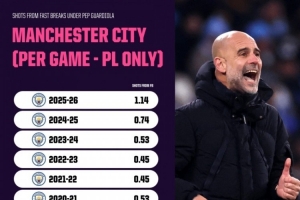 瓜迪奥拉执教曼城英超场均快速反击射门次数: